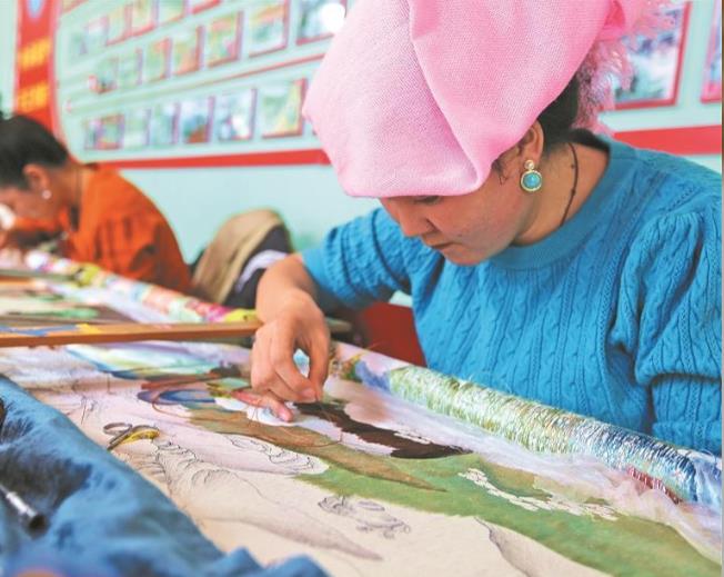 工作間里,村子里的繡娘們正巧手翻飛,埋頭縫制長卷,五彩絲線落點成線、連線成圖……61歲的仁青加不時地指導著大家。