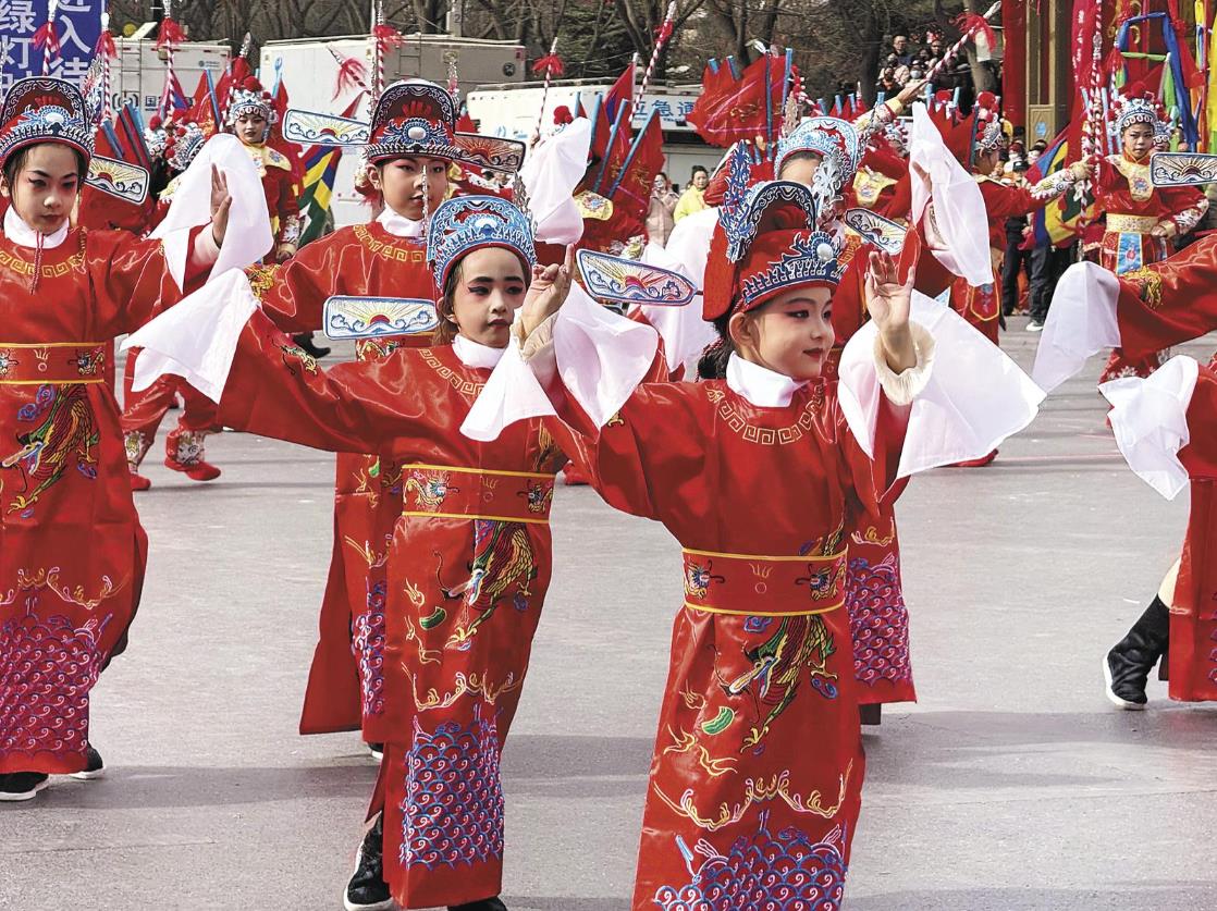 與此同時(shí),城中區(qū)第一屆民俗社火表演賽也在鑼鼓喧天、彩旗招展的熱鬧氛圍中啟幕。寸蹺與高蹺同臺(tái)競技,孩童與成人默契配合、進(jìn)退自如;新式旱船的靈動(dòng)與老式花轎的古樸相映成趣。